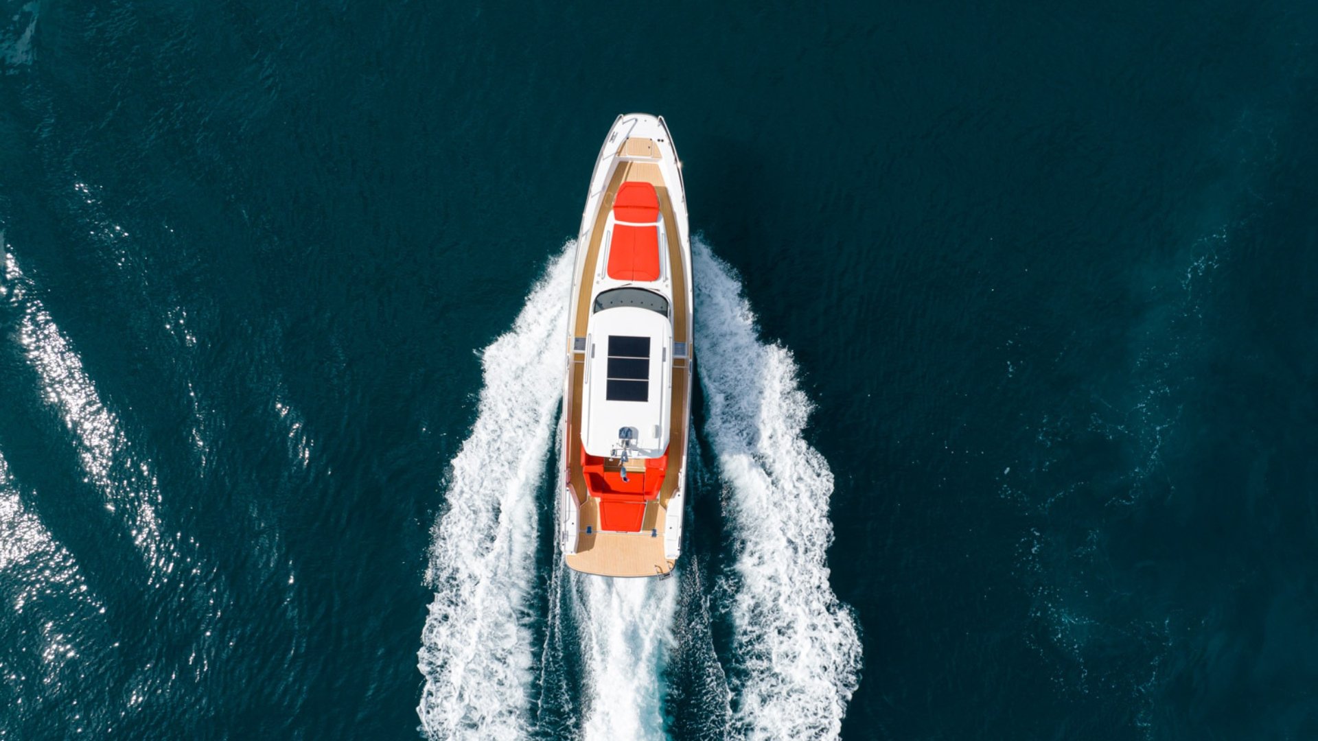 The saloon is bright and versatile, shifting quickly between lounge and dining modes. Below deck, two double cabins, a galley, and a separate head with shower turn longer journeys into effortless escapes. On deck, a large aft lounge and swim platform conceal an impressive 2,500-liter storage compartment for gear and toys.