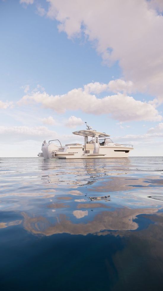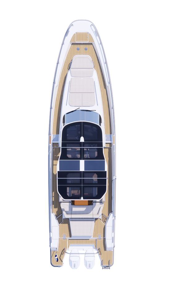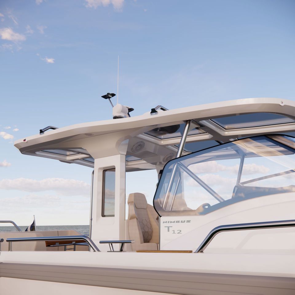 The redesigned T-top now features integrated solar panels and acrylic see-through sections with sunblock—combining modern Scandinavian aesthetics with functional shading for warm-weather cruising.