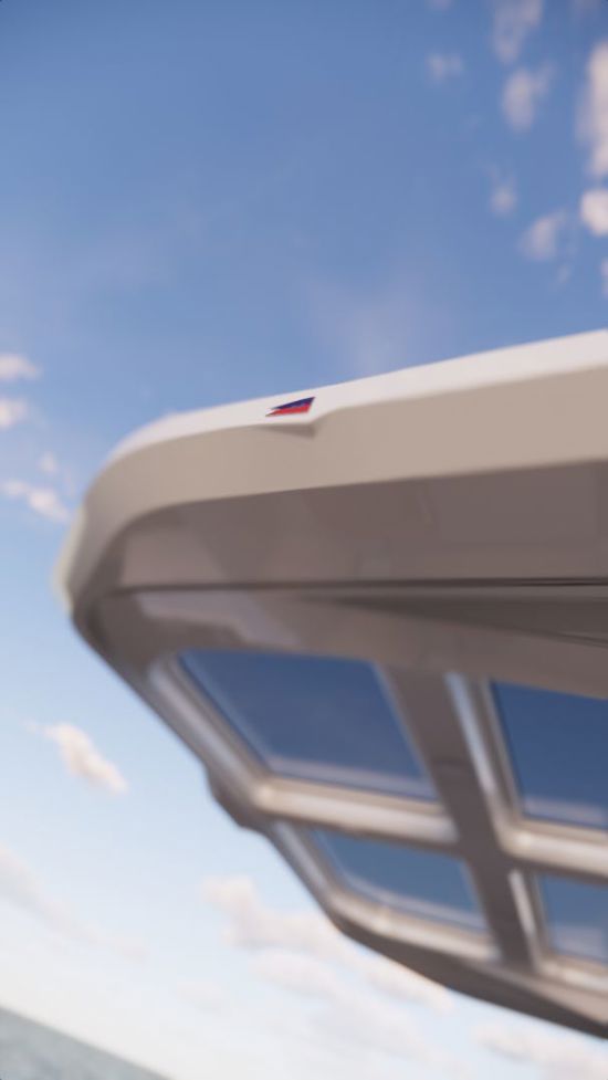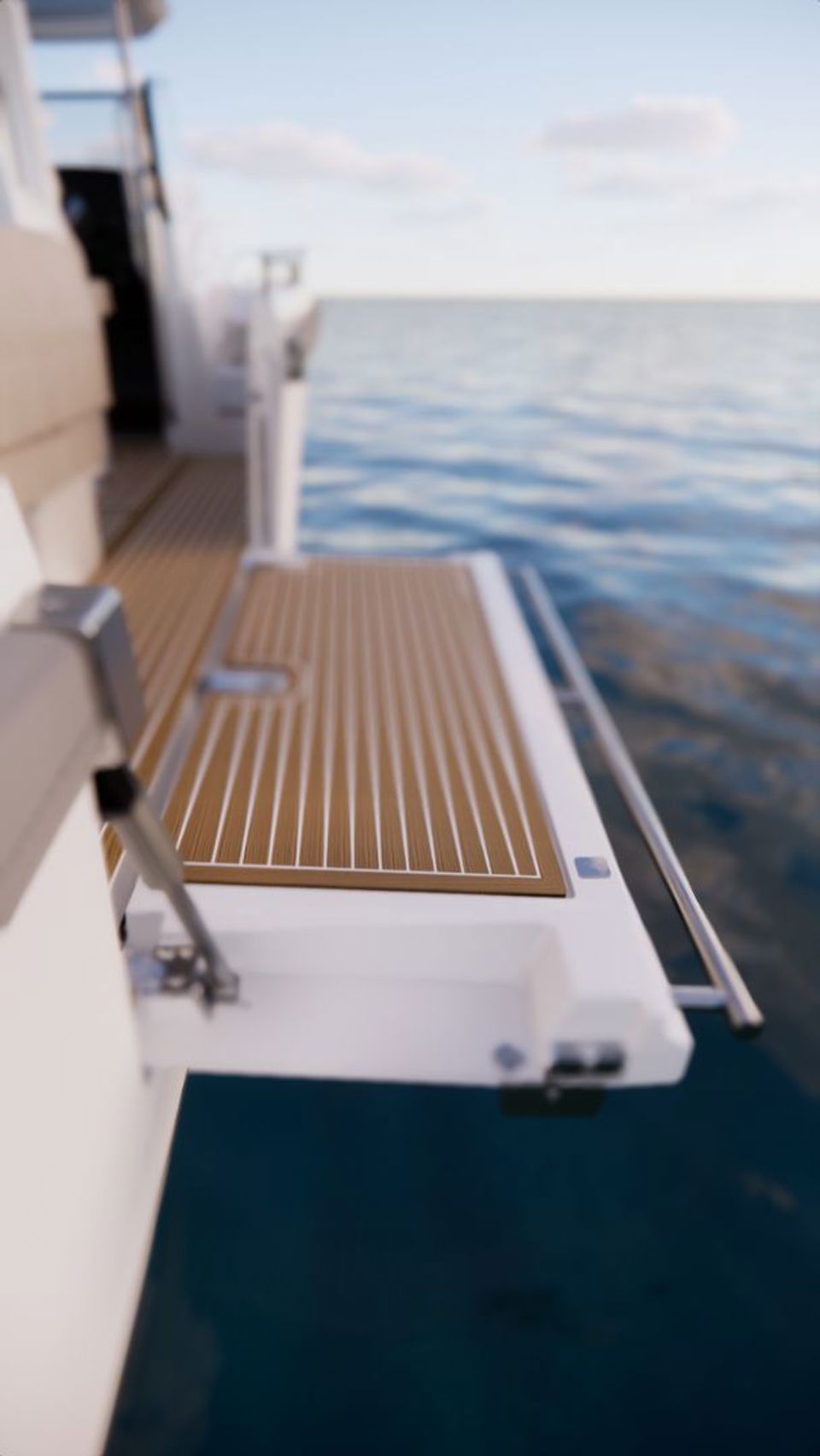 SIDE BALCONY FOR EXPANDED SOCIAL SPACE - new starboard side balcony, which folds out to extend the cockpit into a spacious waterfront lounge. When at anchor, it creates a relaxed, open environment perfect for hosting, unwinding, or simply enjoying the sea.
