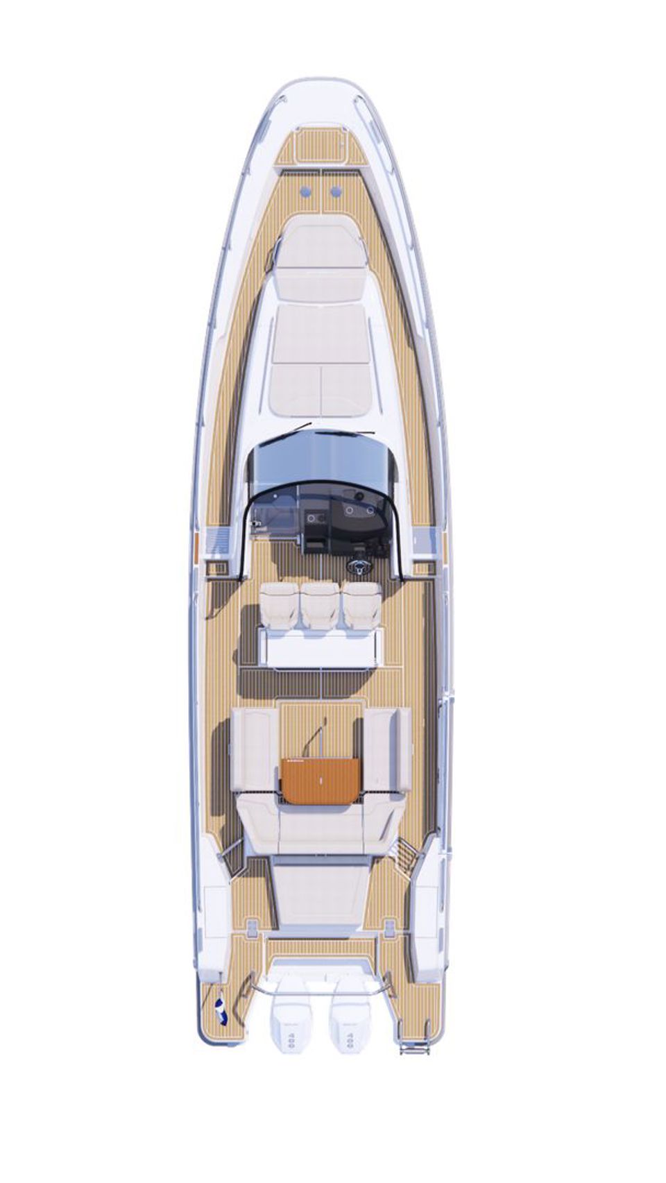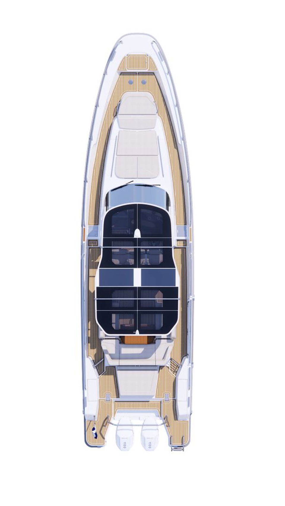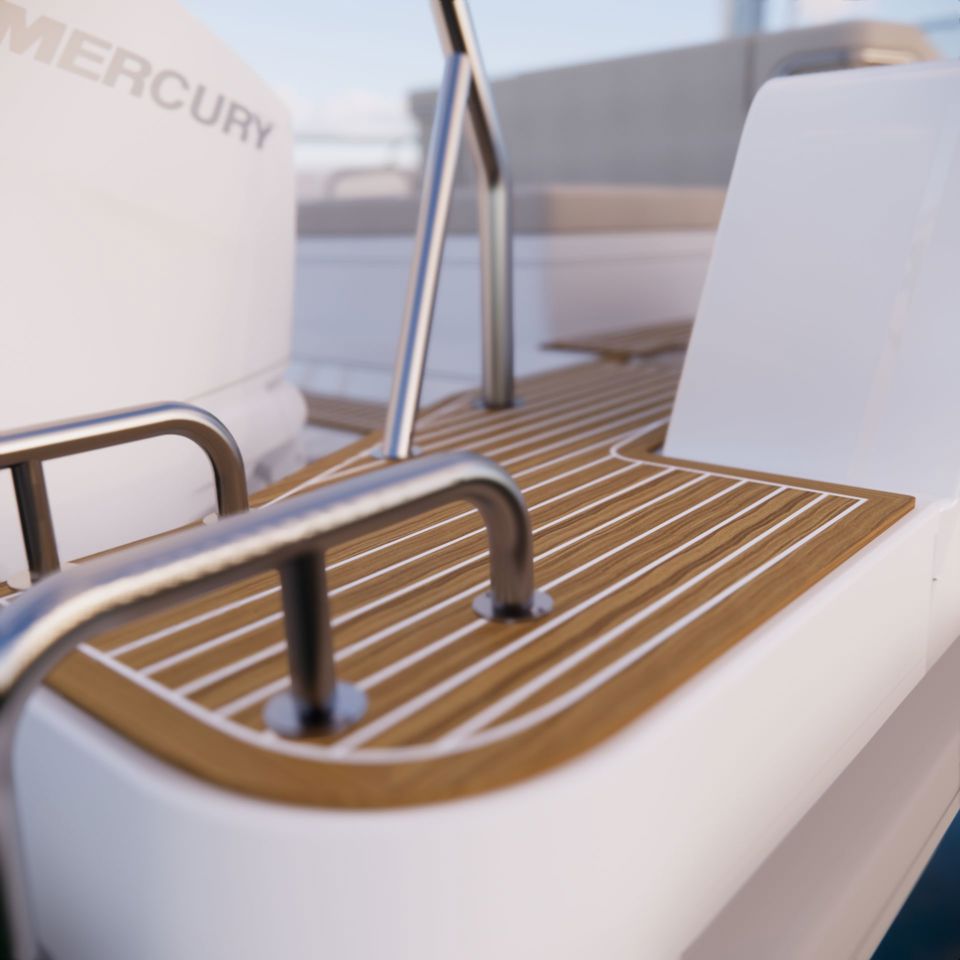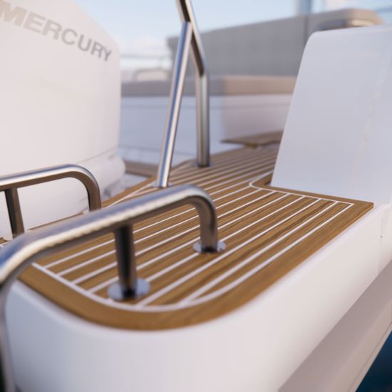 · New extended swim platform with double mould for premium integration and rubrail following through on the hull